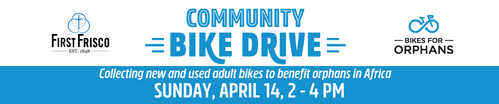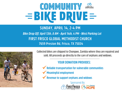 We are partnering with Every Orphan's Hope to host a community bike drive to collect new and used bicycles that will directly improve the lives of people in need. Once the bikes are shipped to the Narrow Road Bike Shop, in Zambia, they are repaired, serviced, and sold to members of the community. The proceeds from bike sales and repairs directly benefit Every Orphan’s Hope, an organization working hard to create new homes and families for orphans and widows in Zambia.
